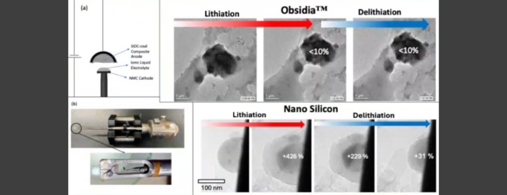A comparison of an Obsidia particle vs a nano-silicon particle during lithiation and delithiation, indicating that Obsidia experiences much less swelling than silicon. Courtesy University of Central Florida.